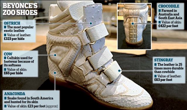 Does Beyonce really need these custom designed (by PMK) sneakers? Check out the picture and you will see at least five different living beings (stingray, ostrich, calf, crocodile and anaconda) gave up their life so that Beyonce can strut around in misguided luxury. It is not only Beyonce who is guilty of this fashion faux pas, but her husband is equally guilty too. Jay-Z too has ordered a pair of sneakers made up of couple of animal/reptile skins.
