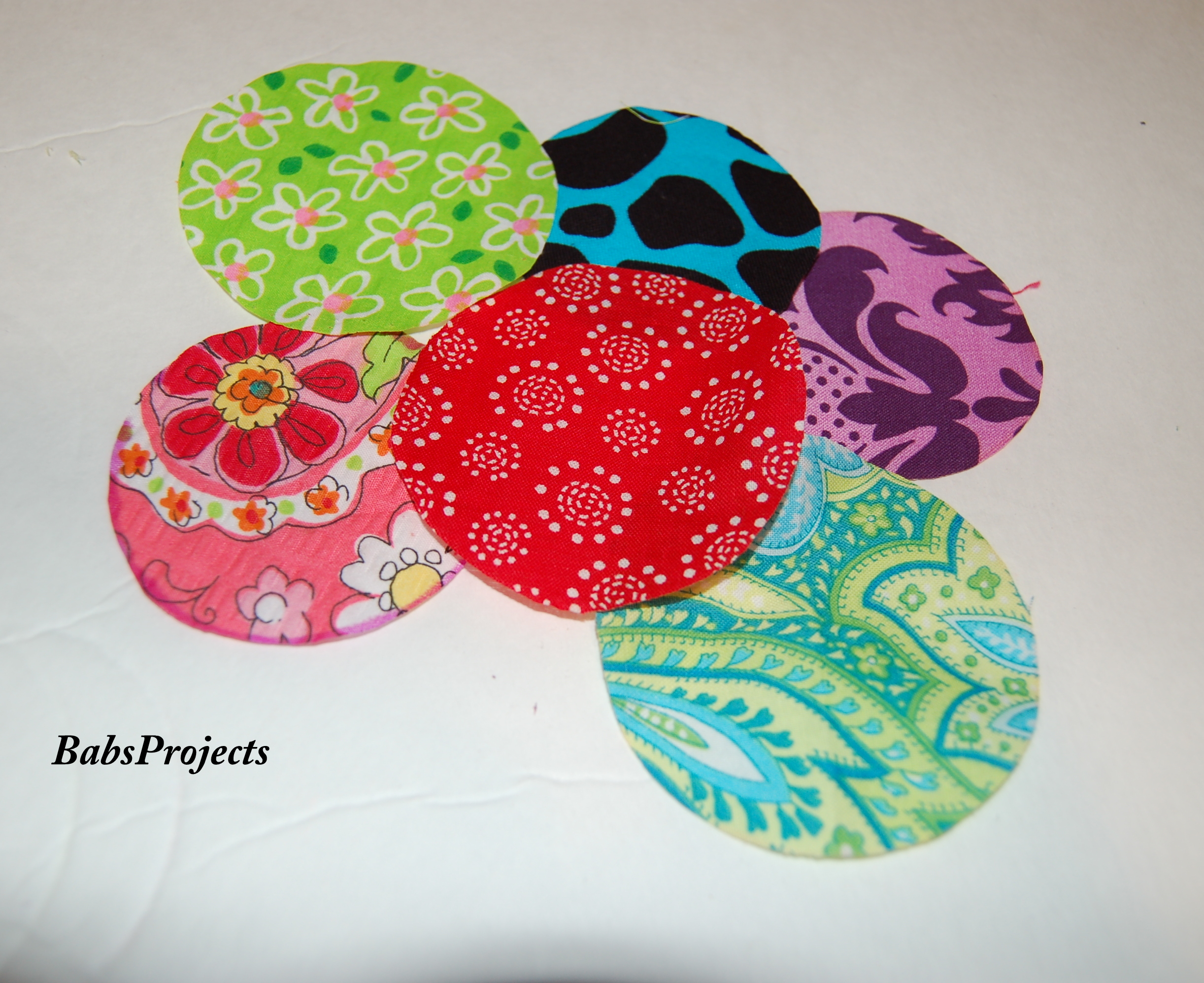 The next thing I did was cut out different fabric circles from the scraps I already had from my previous projects. I did not exactly measure but the fabric circles were approx. 2 1/2″ in diameter.