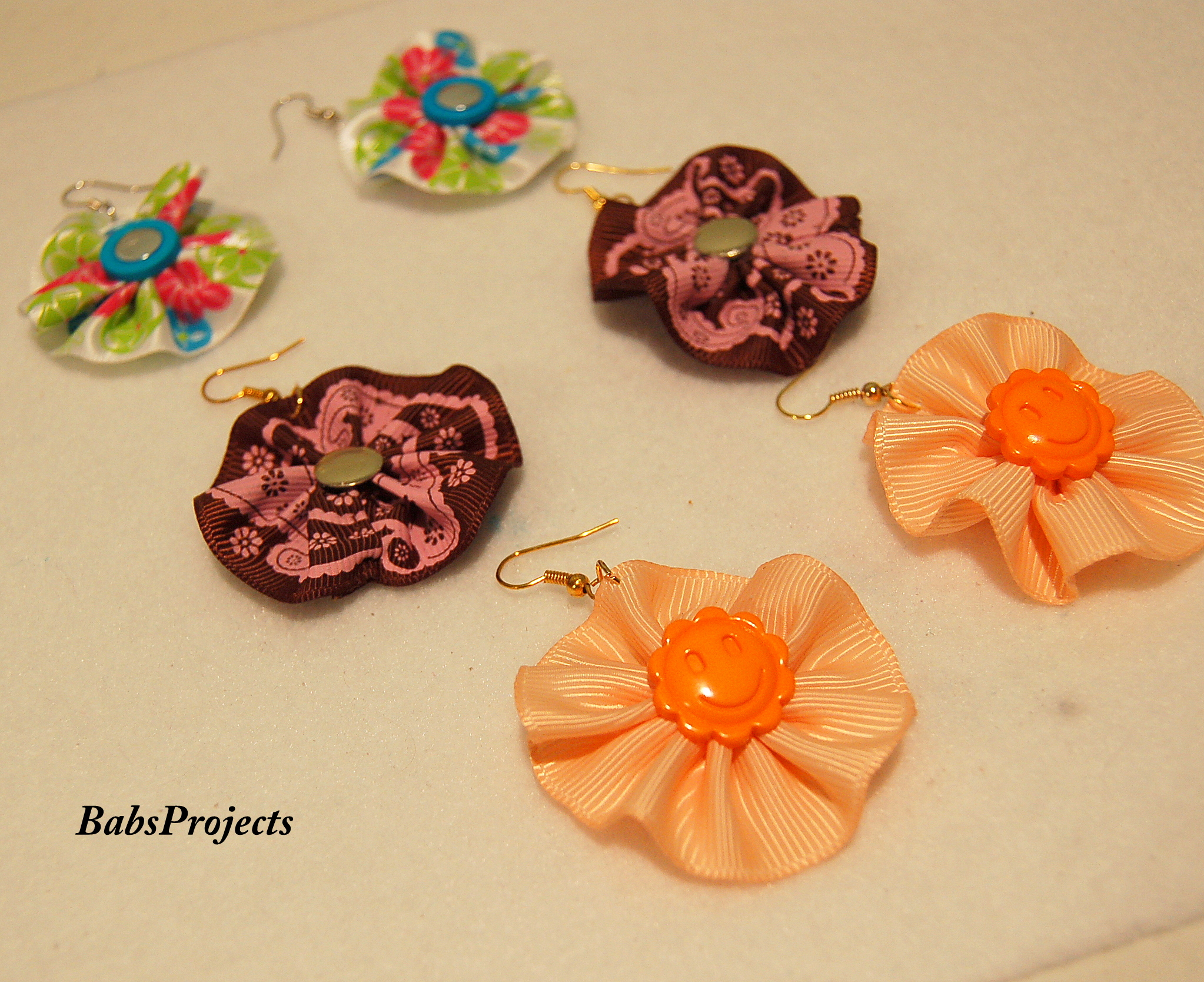 Since I had so much fun doing this project, I went ahead and made two more pairs. Although I was happy with these earrings, I genuinely wish I had some grown-up patterned ribbons with me. The earrings would look really weird on me. On the other hand I think it is perfect for “T”. What do you think???
