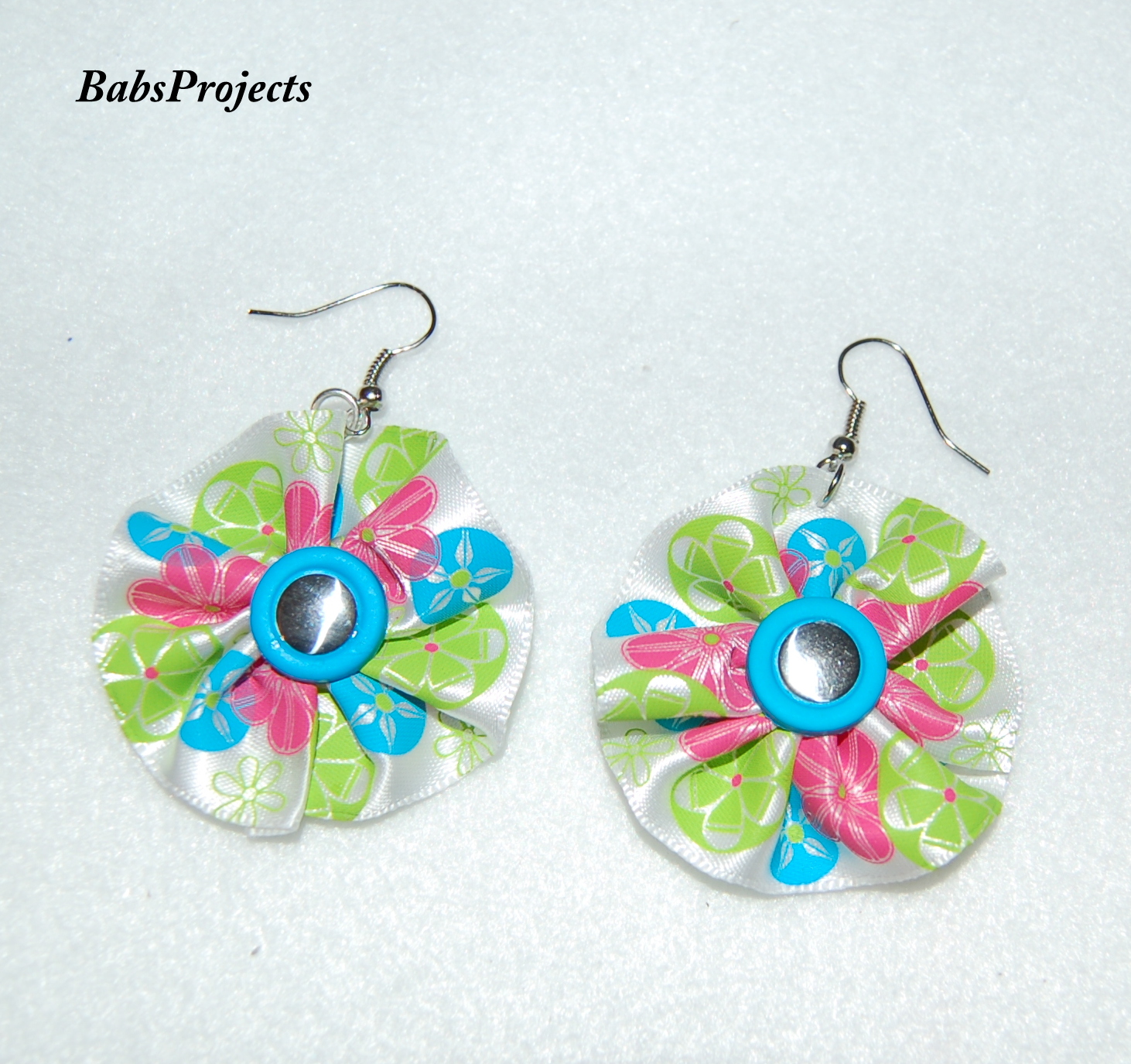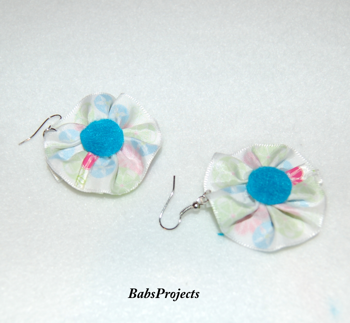 To make it all neat and pretty, I cut out small blue felt circles and glued them on the back. Finally I added some earring hooks and the ribbon earrings were all ready for use.