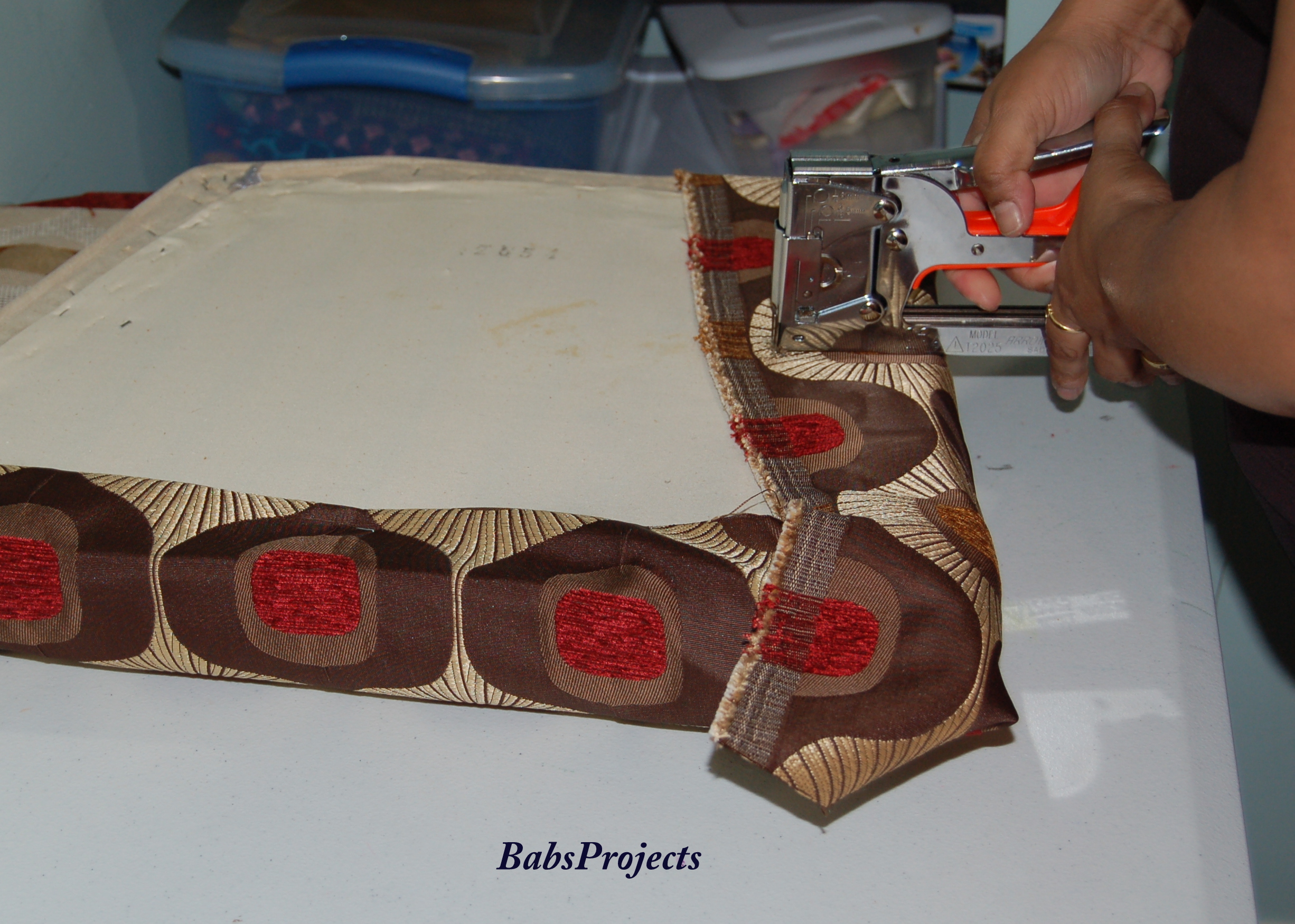 After placing the fabric wrong side up, I positioned the chair pad over it. I gathered the fabric over the chair pad on one side and stapled it. I did this on all sides, so as to secure the fabric in place. Of course, I wish I had three hands to do that.