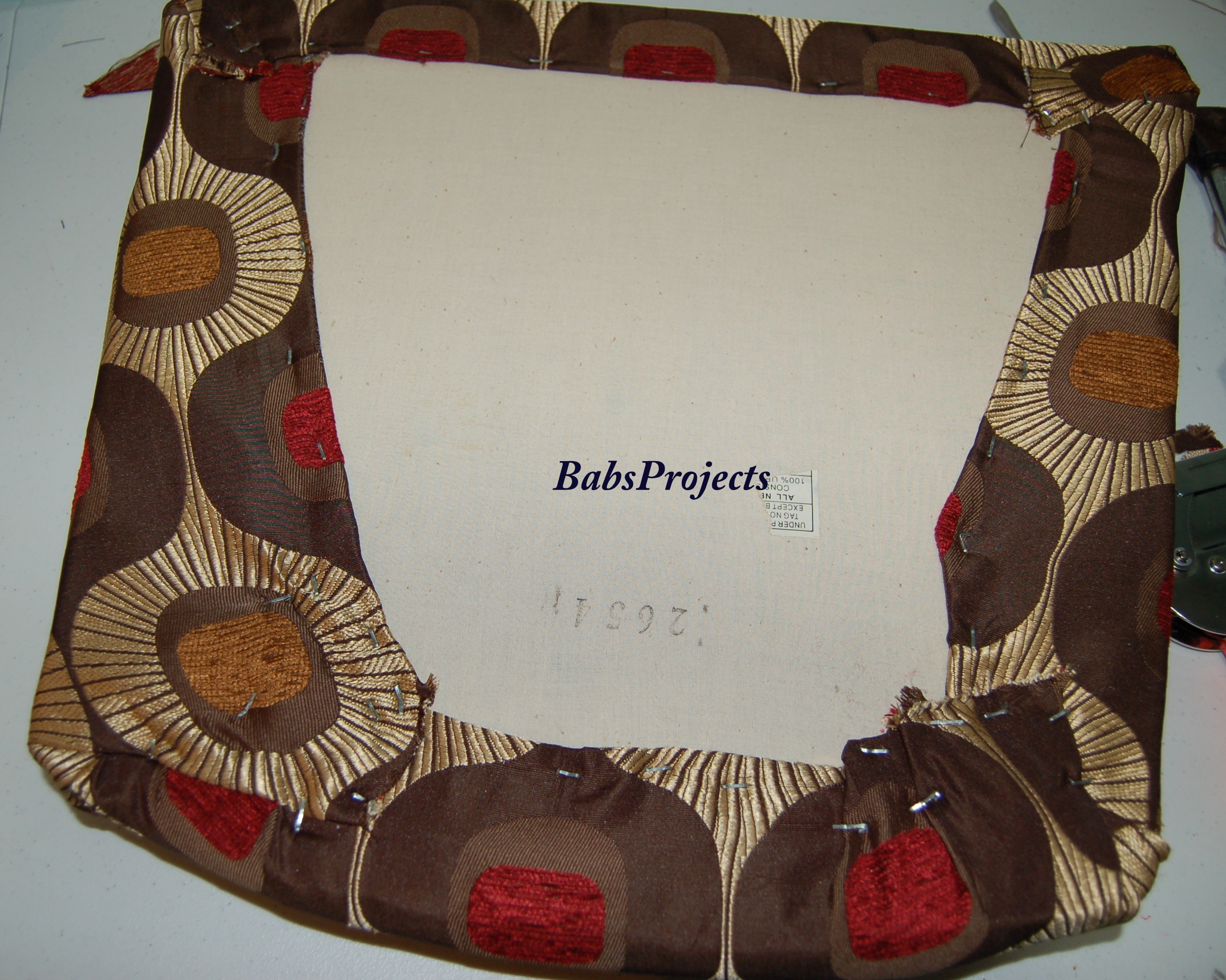 Let me tell you stapling the sides are easy. The worst was yet to come. The corners are an absolute pain. I had to make sure I had gathered them properly without a lot creases and had to pin them several times. Well, I am not an expert but I did try my best. Check out the back of the finished chair pad below.