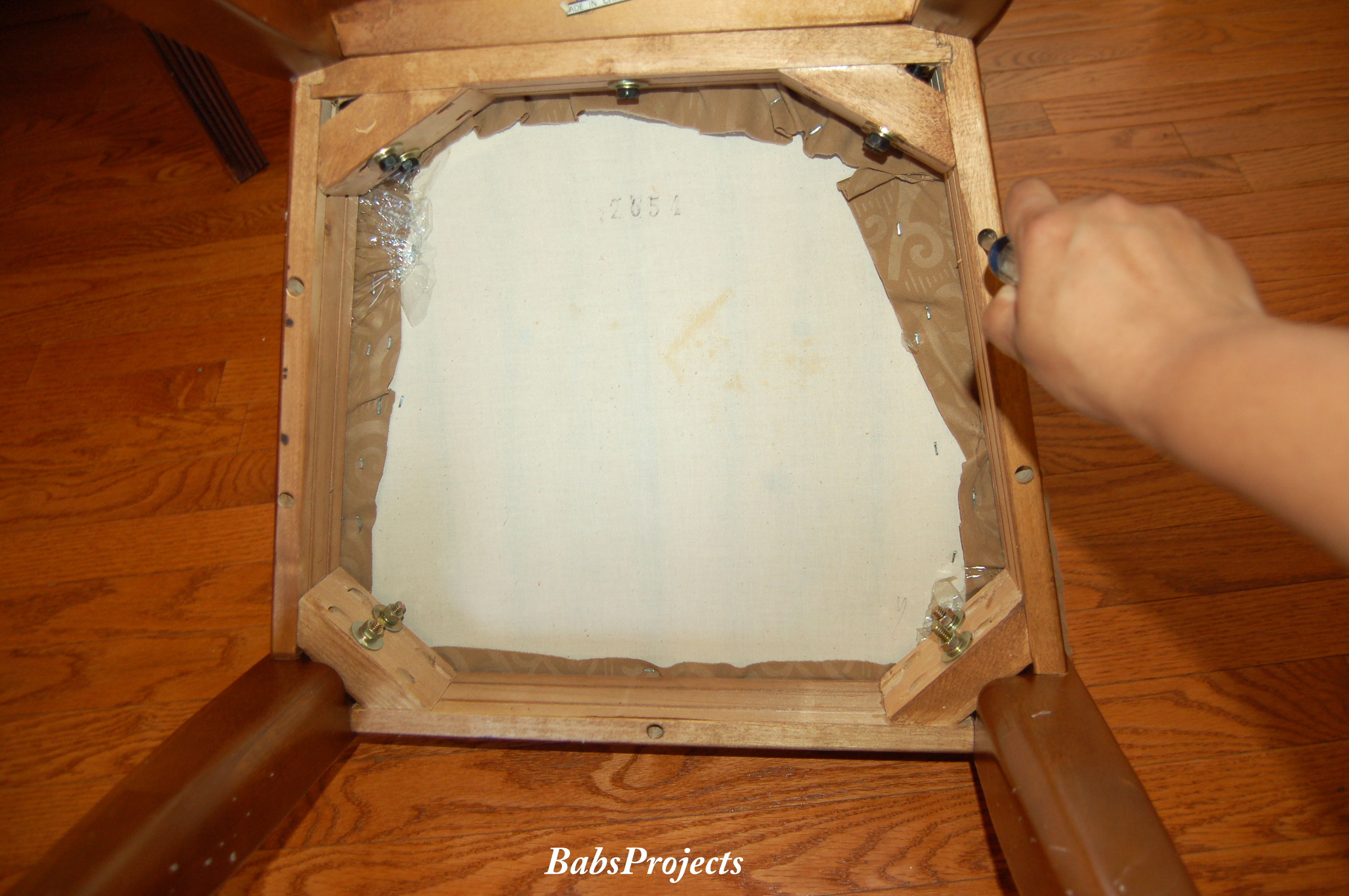 Obviously the first thing to do was to unscrew the chair pad from its wooden bones. So I turned the chair upside down and unscrewed the five screws with the help of a Philips screwdriver.