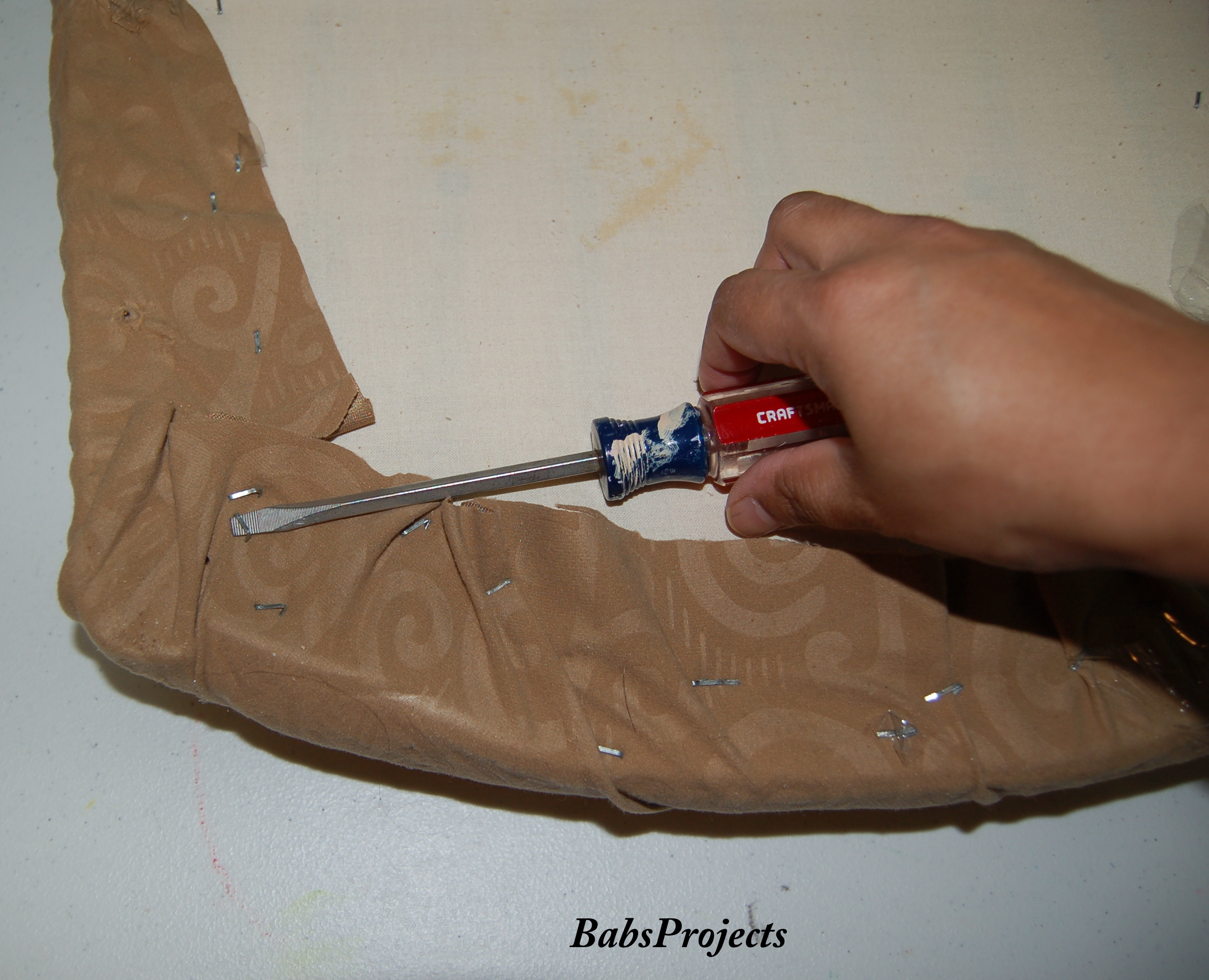 Once I removed the chair pad, its was time to take out the old staples pins. I found the easiest way to do that was to use a flat head screwdriver. I removed all the pins and threw the old fabric as well as the staple pins in trash.