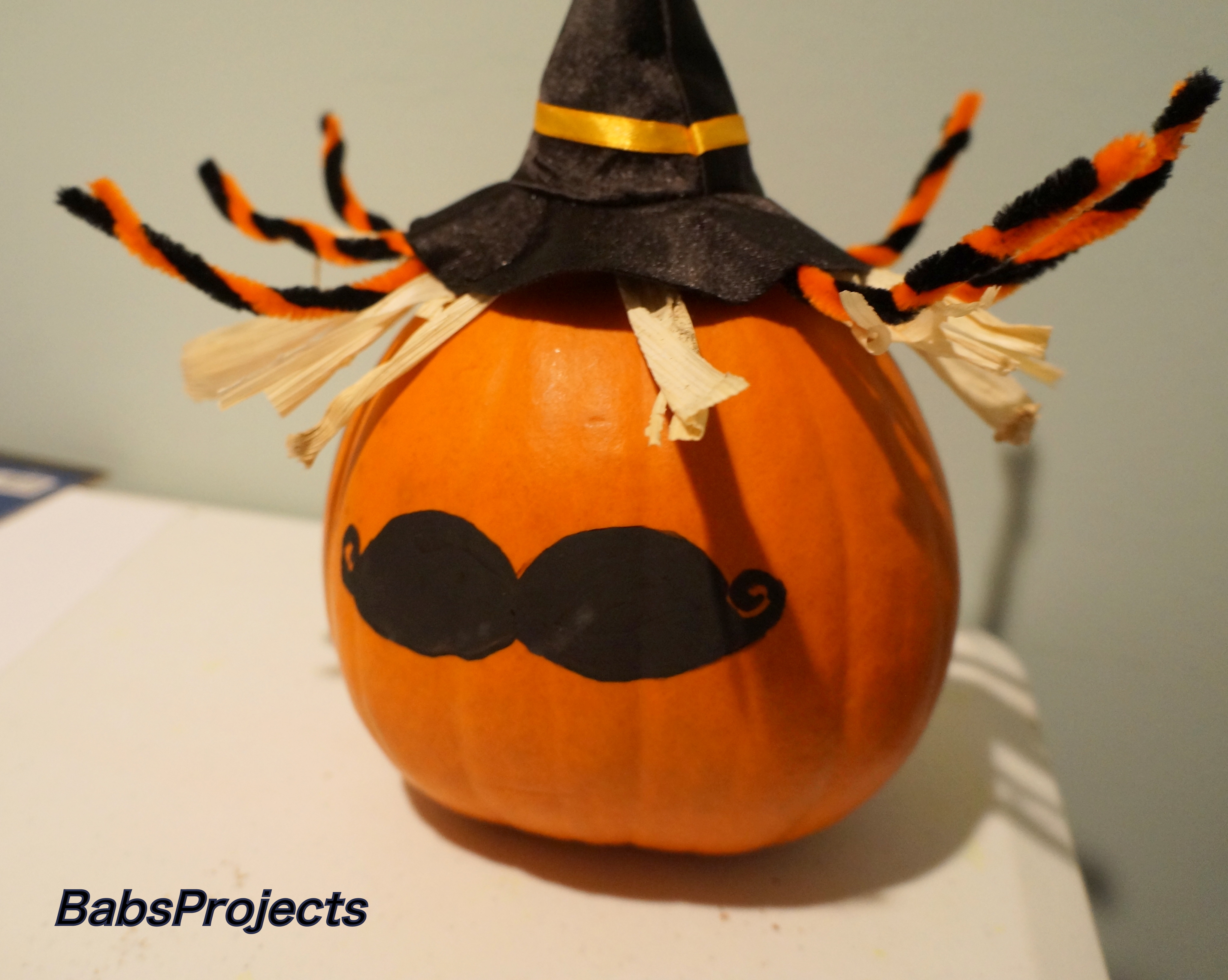 She finished the whole look by placing a mini witch’s hat over the stalk. Her Mr. Pumpkin was all ready to rock…. (although I feel he looked like he was balding from one side)