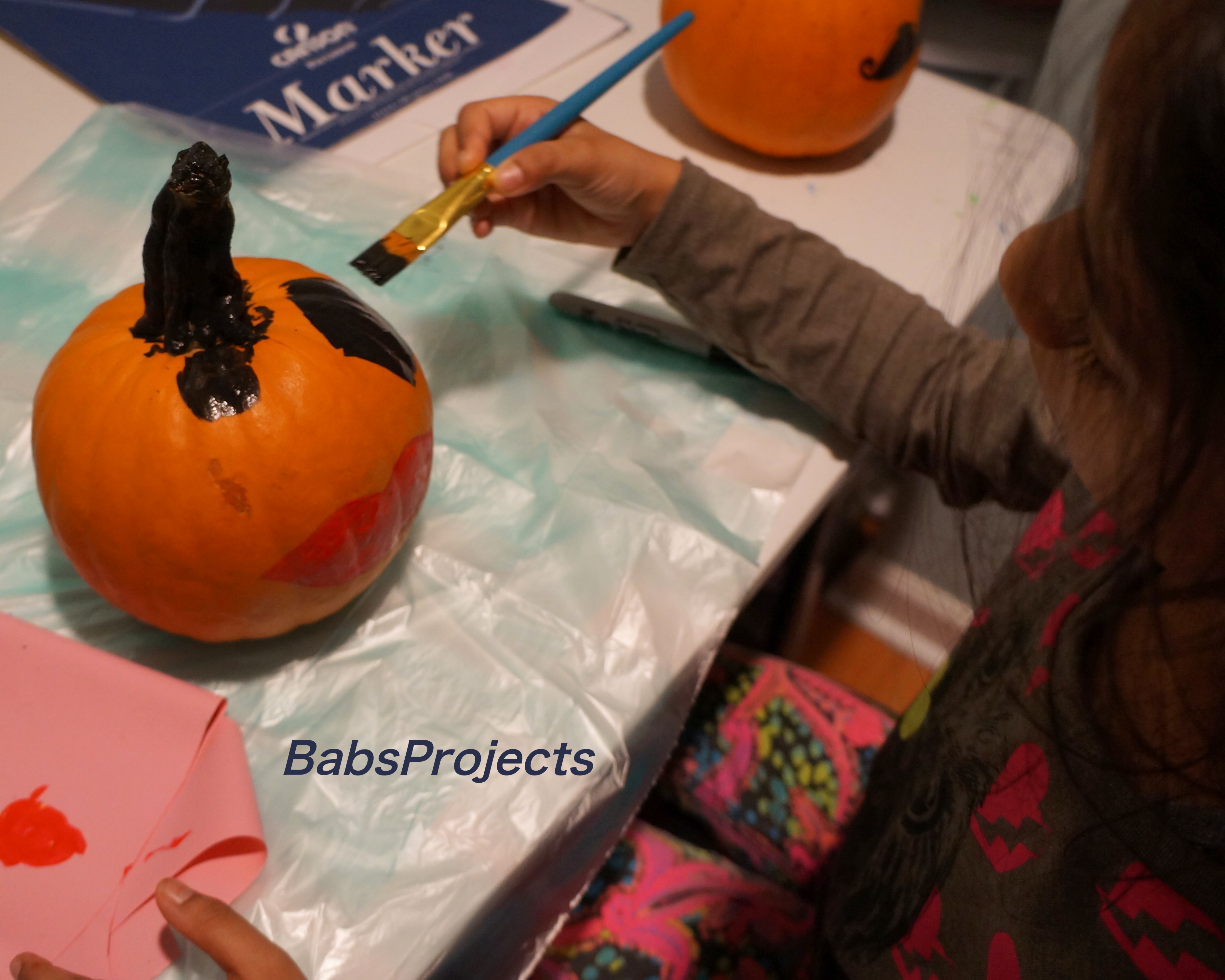 “S” had a bit difficult job to do. She had to paint the whole pumpkin black. She patiently did that and then we waited for the paint to dry. Since it was their sleeping time, I told them to catch up with it the next day.
