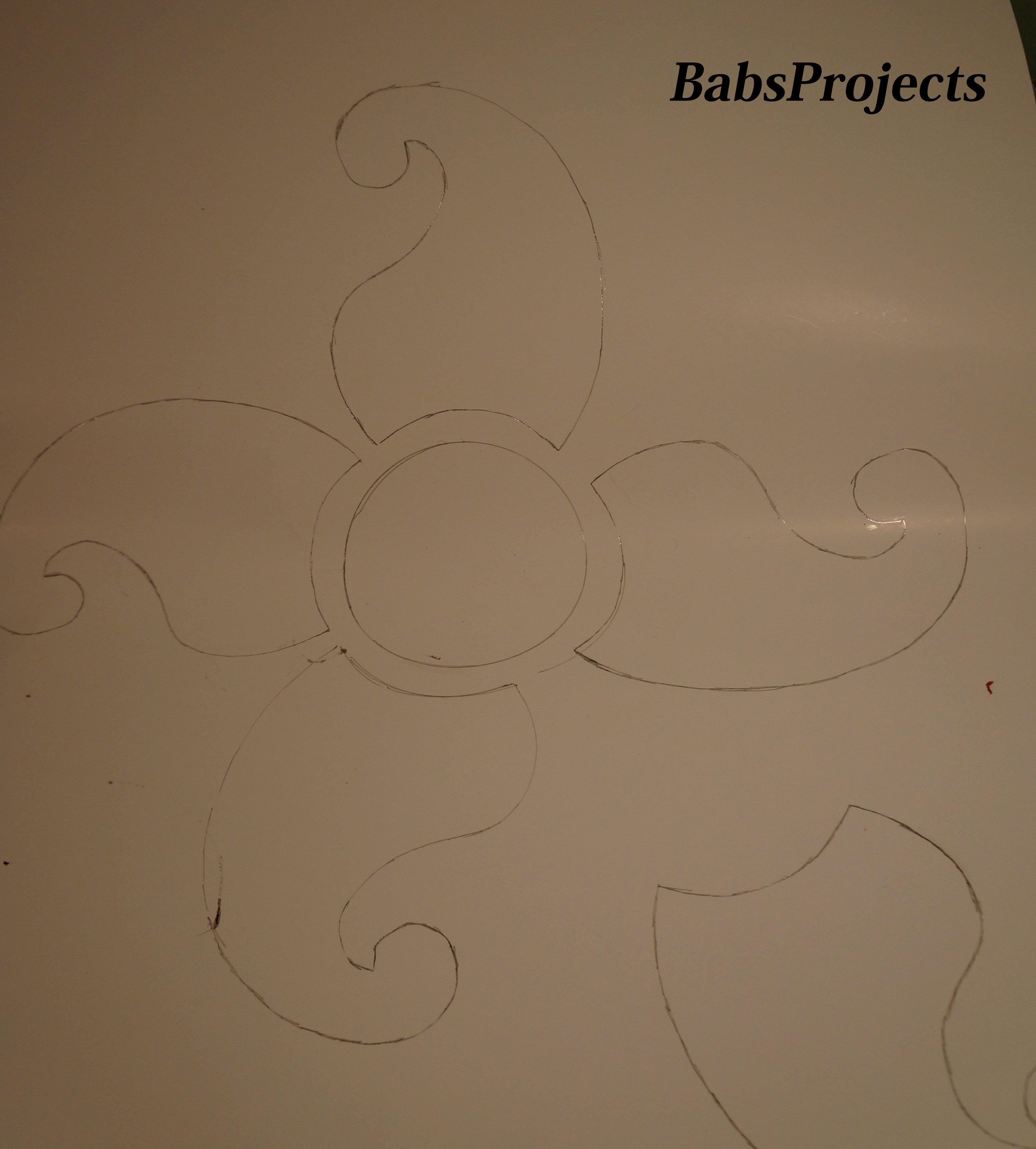 I started first by drawing the pattern on white poster paper. The next time I make this I am going to experiments with some other colors of poster paper. ‘S’ wanted to help me, so I asked her to cut out all five pieces including the circle.