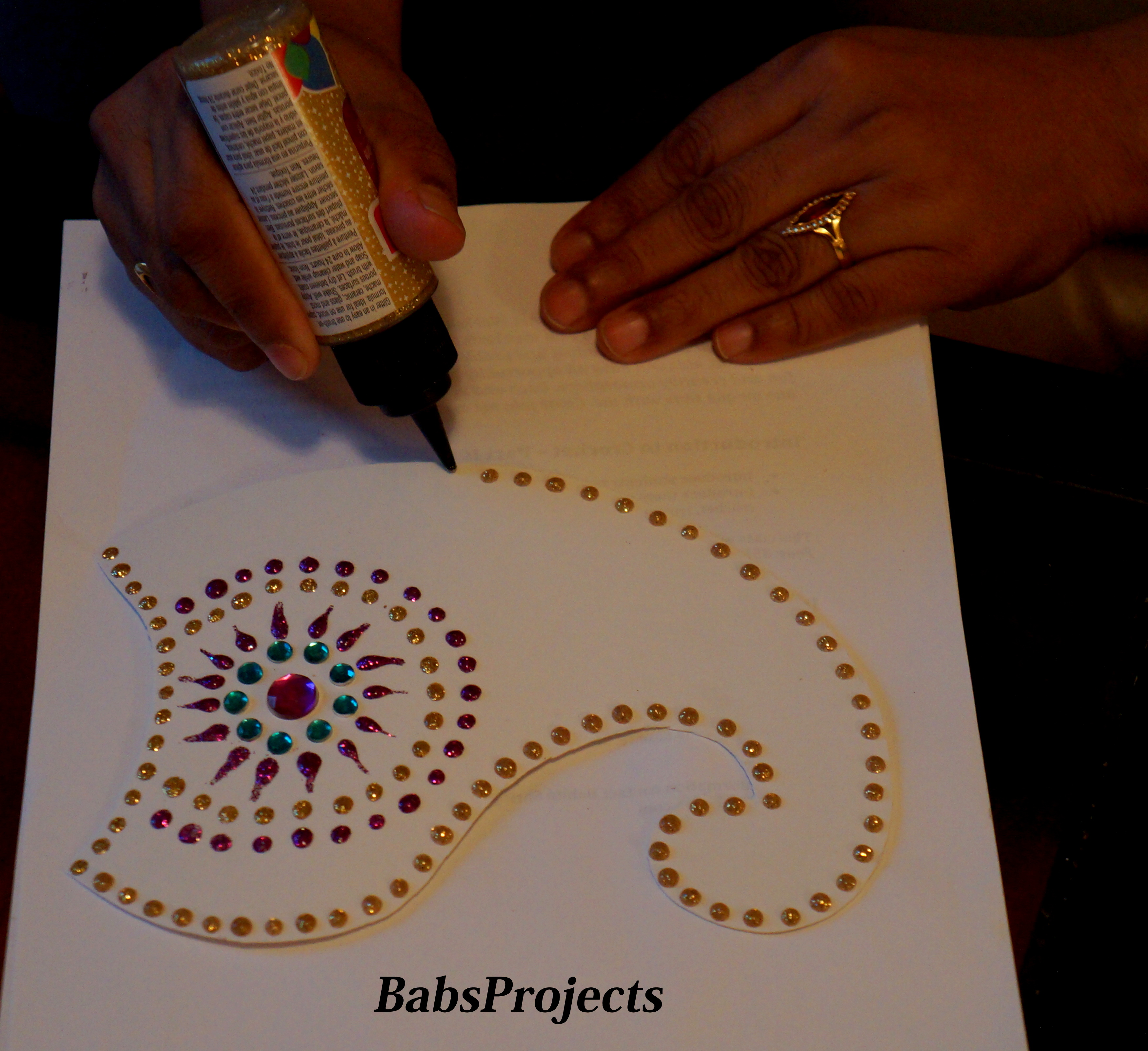 This project got delayed because I could not find the specific supplies (flat beads, crystals etc) in any of the crafting supply stores. So during my trip to Michaels last week I decided to stop obsessing over specific supplies and instead use basic acrylic paint and a box of colorful crystals.