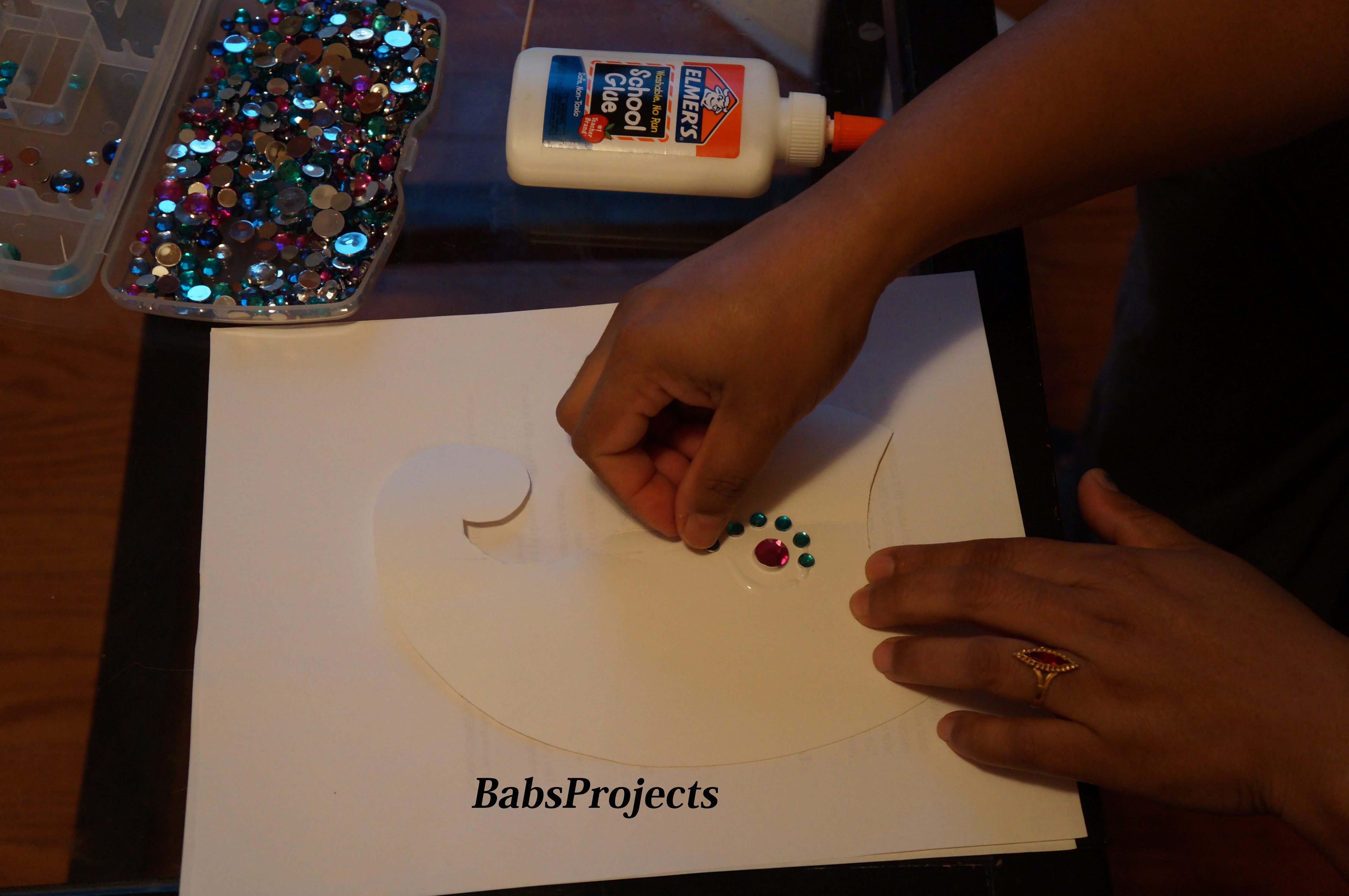 Next I glued a fuchsia crystal at the bottom center of the paisley piece. I made sure to do this on the other side where there were no pencil marks. I then surrounded it with smaller turquoise blue crystals.
