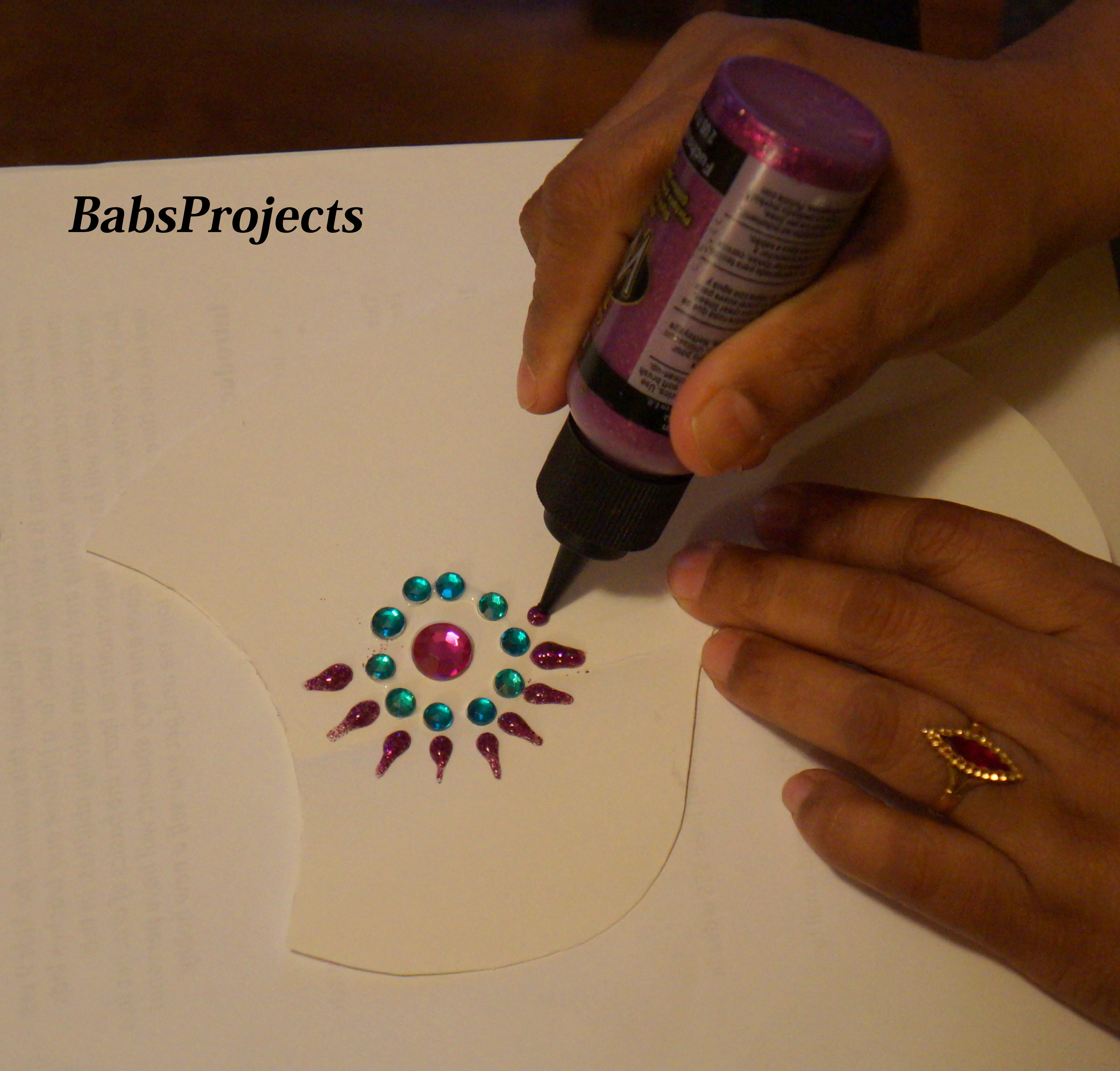 I finished the pattern by alternating gold and fuchsia glitter paint and gold glitter. I wanted them to look like beads, so tried my best to do that. Finally I finished off the edge of the paisley piece with gold glitter paint. I went ahead and repeated the same process to all the other four pieces. For the circle piece I did not use any crystals, as that was the piece that was going to hold the diya (candle). I finished it with gold and fuchsia glitter paint.