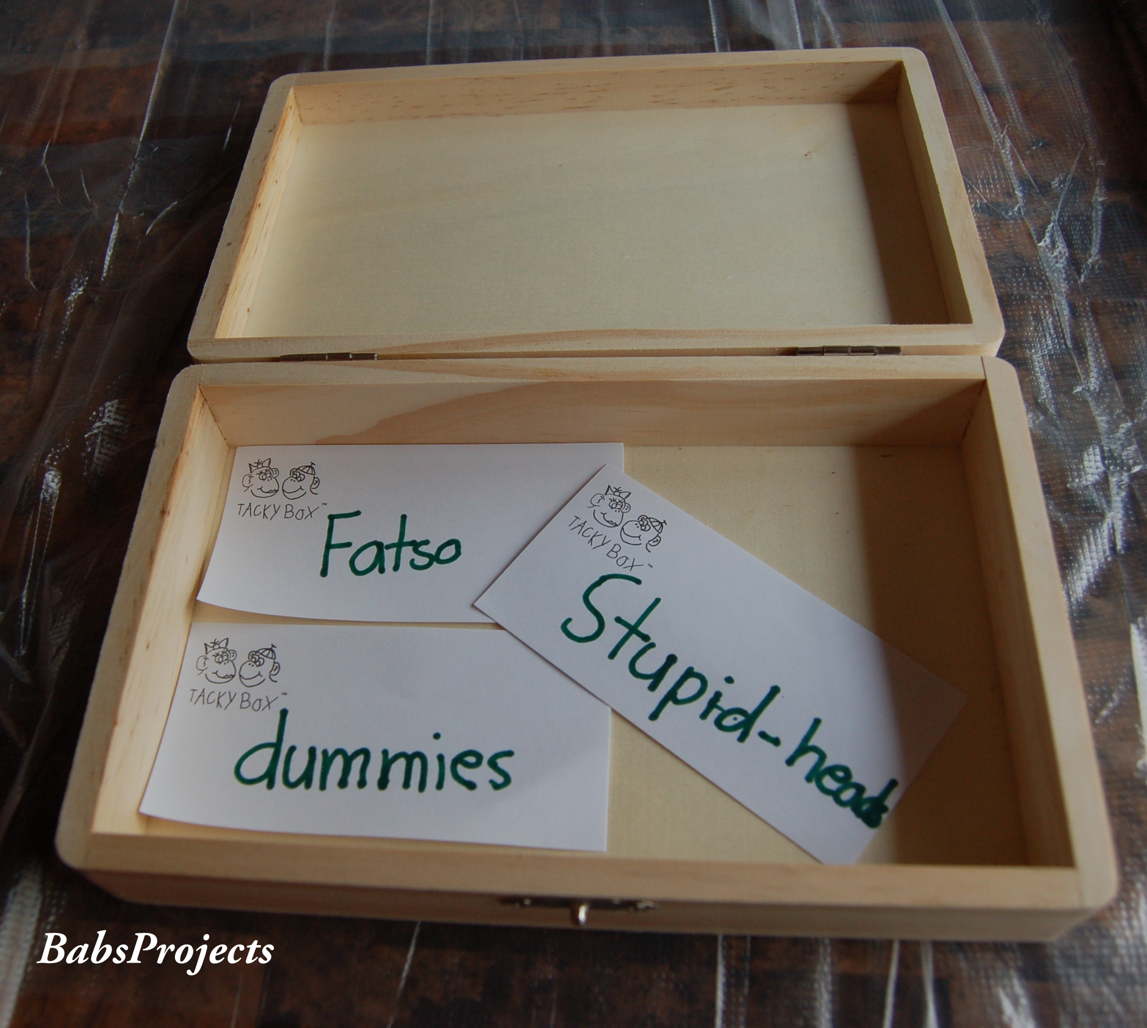 My son has taken to using the word ‘idiot.’ I have no idea where he heard it or why my gentle corrections are not stopping him from using it. That would be the first word in our Tacky Box, let me tell you!! 🙂
